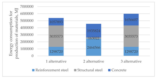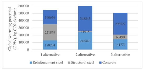 In the case of global warming potential emissions (Figure 13), the first alternative requires the lowest reinforcing steel, and therefore the CO2 emissions produced by this material are the lowest, i.e., 47% lower compared to the second and 10% lower compared to the third alternative. The amount of CO2 emitted during the production of structural steel is lowest in the second alternative, i.e., 95% less compared to the first and 82% less compared to the third alternative. The effect of concrete on increasing global warming potential is lowest in the first alternative, i.e., 45% less compared to the second and 36% less compared to the third. Comparing total amounts, the third alternative generated the least amount of CO2, 7% less compared to the first and 17% less compared to the second.