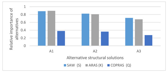 Step 5. Application of the multi-criteria aiding methods SAW, ARAS and COPRAS and assessment of alternative structural solutions in terms of sustainability. This step also includes the analysis of results.