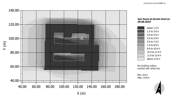 Figure 2). The longer part of the space is oriented along the east–west axis, so the floor on the south side of the courtyard stays in the shade for most of the day. The estimated atrium surface is 650 sq m. Only less than 1% of which remained in the sun for eight or more hours on the modelled day. About 22% of the area was in the sun for less than 59 min. In total, about 40% of the surface was illuminated for more than 4 h.