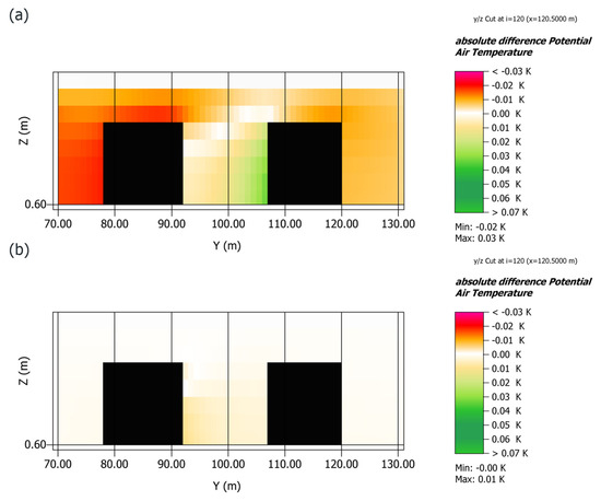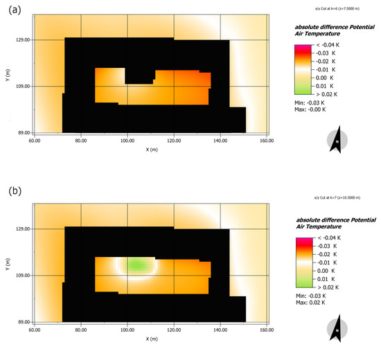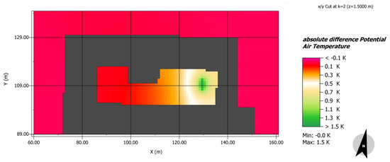 Figure 19). There was a higher potential seen in the western corner and lower in the eastern of roofing case in comparison with the initial state. The absolute air temperature difference extended from −0.23 K to 0.12 K with a mean of −0.10 K and median of −0.11 K. It means that covering the atrium space in that manner has potentially a negative effect on air temperature at 1.5 m height on a very hot, almost windless day. Taking into consideration the vertical relation of temperature and looking at the cross section (