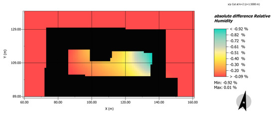 Table 2. In all of the cases the relative humidity value increased compared to the initial state. To sum up, the greatest impact on the relative humidity value at the tested time have southern and northern locations. It is most likely related to the surface of vegetation and the proportions of the atrium’s interior. Regarding the factor of placement and the green wall size, the modelled eastern location outcome, with a mean (−)0.31% and median (−)0.24%, was relatively high in comparison with other scenarios.