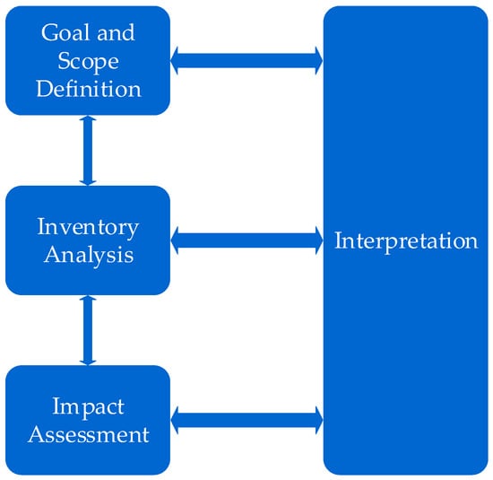 There are different ways to gauge the amount of pollution emitted during each and every step of the life cycle of a building. Among those is the LCA method. In the context of construction, LCA is a comprehensive approach to evaluate all stages of the building life cycle, including the extraction and production of materials, their transfer and transportation, construction work, use and maintenance, and eventually demolition, in order to give a broad and full assessment of a building’s total pollution. All in all, LCA provides an all-inclusive estimate of a construction’s environmental impacts via inspection of all processes, activities and products involved in the life cycle of a building—also known as the cradle-to-grave model [13]. The LCA method deliberates different scenarios and possibilities so as to minimize energy and resource consumption and decrease the environmental footprint of construction materials. The LCA of a building is divided into three stages of pre-construction, construction and post-construction [14]. This assessment method creates a number of inputs (such as raw materials and energy) and several outputs (i.e., atmospheric emissions, waterborne waste materials, solid wastes and other pollutants), the sum of which leads to environmental damage, such as global warming potential, possible damage to the ozone layer, acidification potential, increasing energy use and eutrophication [15]. According to Figure 1, the LCA method includes four stages, namely, goal and scope definition, life cycle inventory analysis, life cycle impact assessment, and life cycle interpretations; and all of them are interrelated [16].