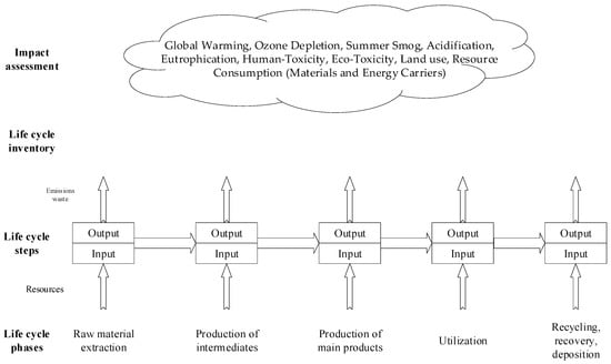As illustrated in Figure 2, the Gabi software program takes various processes into account, creating for each process one input and one output, and will eventually generate links between all the processes to form a supply chain. This program evaluates all stages of life cycle to bring about a comprehensive assessment of global warming potential, ozone layer depletion, acidification, eutrophication, human toxicity, and resource depletion, among others [21].