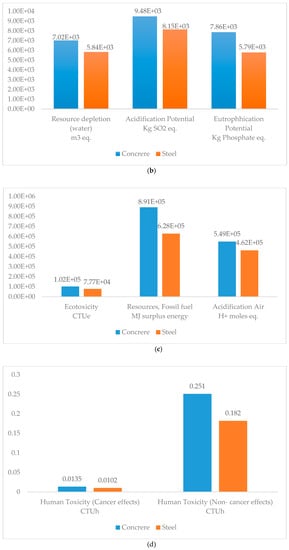 Results from the GaBi software program reveal comprehensive information concerning the impact of each stage of construction frames’ life cycle. In other research, various parameters have been taken into account in order to analyze such impact. Factors including global warming potential, human toxicity potential, eutrophication, fossil fuels depletion, and acidification have been considered for impact assessment [11,26,27]. In this research, as shown in Figure 6, the impact of the global warming potential for a period of 100 years, acidification, eutrophication potential, human toxicity (considering cancer and non-cancer effects), and resource depletion (water, minerals, and renewable resources) as well as climate change, fossil fuel depletion, and ecotoxicity were assessed. According to results obtained from GaBi and a comparison made between two concrete and steel buildings, it has been made clear that in most cases, concrete buildings leave more pollutants. As depicted by Figure 6a, with its production of 9120 t (CO2 eq.), the concrete building had a substantial impact on GWP as opposed to the steel building which roughly generated 24% less emissions. The EoL period of the concrete building created 2000 t (CO2 eq.) more pollution than that of the steel building, thus contributing significantly to the marked difference between their impacts. Furthermore, the two stages of raw material acquisition and material production contributed respectively to 21.67% and 0.5% of the concrete building’s impact on GWP; in contrast, the impact on GWP of material acquisition and production for the steel building were 23.9% and 1.0 %, respectively. With respect to AP, the concrete building produced 9480 kg (SO2 eq.), which was 1330 kg higher than similar emissions by the steel building. Raw material acquisition highly influenced the AP, such that the emission at this stage was 78% and 81% for concrete and steel buildings, respectively. With regard to the effects of climate change, the two concrete and steel buildings respectively created 7550 t (CO2 eq.) and 5740 t (CO2 eq.). The concrete building caused further climate change effects mainly due to raw material acquisition and EoL stages, which produced 27% and 16% more pollution, respectively. Additionally, the EoL stage had the greatest impact on EP, since the amount of concrete building’s pollution was about 2000 kg (phosphate eq.) higher than its steel counterpart at this level. As demonstrated in Figure 6e, the steel building had a more detrimental effect on the ecosystem than the concrete building only in one category—resource depletion (minerals, fossil, and renewable resources)—merely by 3.37 kg (Sb eq.) from among all the results of impact assessments. Figure 6 reveals the pollution amount of the two construction frames in each impact factor.
