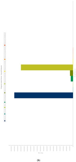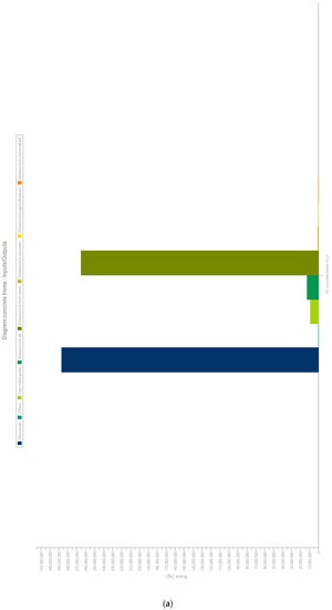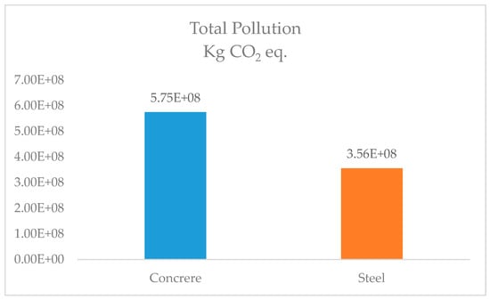 Results of these studies revealed that the outcomes could vary case by case considering different geography and climate conditions. Moreover, using various methods and software programs can also lead to certain results [29]. Therefore, in this research, where the GaBi software program was used for analysis, the outputs indicated that, in general, the concrete frame leaves more pollution behind. Figure 7 shows the total pollution with respect to all impact factors. Based on this figure, the total amount of pollution by the concrete frame in all stages of its life cycle was almost 219,000 t (CO2 eq.) higher than that of the steel construction frame.