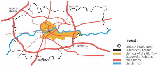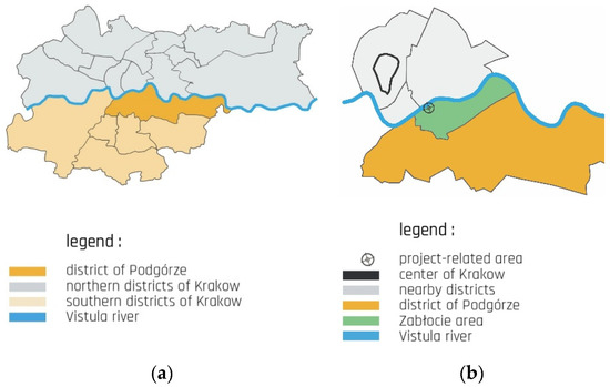 Diagrams showing the location of the project-related area: (a) Podgórze district area in the context of other Cracow districts; (b) Zabłocie area within the scope of Podgórze district and in proximity of the Old Town [2] (elaborated by E. Latusek).