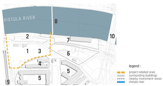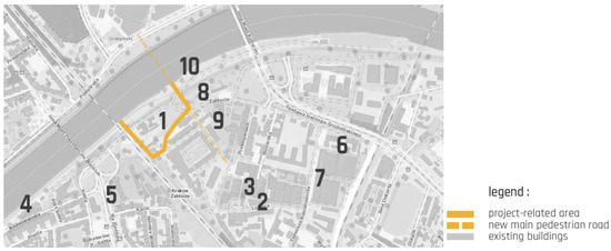 Cultural dominants of Podolski Boulevard (Bulwar Podolski): (1) Project-related area; (2) Oskar Schindler’s Enamel Factory; (3) Museum of Contemporary Art in Kraków-MOCAK; (4) Centre for the Documentation of the Art of Tadeusz Kantor–Cricoteka; (5) Centre of Literature and Language–‘Planet Lem’ (‘Planeta Lem’); (6) Zabłocie Business Park; (7) Student Hall of Residence Livinn Cracow; (8) Park ‘Vistula Station’ (‘Stacja Wisła’); (9) ATAL Residence; (10) Cracow Marina, (elaborated by E. Latusek).