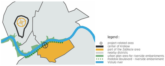 The research on the formal and legal state of the area of Zabłocie and the project-related land encompassed many urban planning documents, which had an impact on designing decisions in the scope of land development, position of the object on the building plot and its forms. The analysed formal and legal documentation first included documents such as the Building Law, types of flood risk and other legal acts. The legal–formal documentation analysed included first of all documents such as the Act on the Building Law and types of flooding risk. The analysed legal acts concerning the project-related area encompassed the following: A Study of Conditions and Directions of Spatial Development of the City of Cracow (Kraków), Prognosis of Environmental Impact, A Local Programme of Zabłocie Regeneration, Update of Municipal Regeneration Programme of the City of Cracow (Kraków), A Local Plan of the Vistula Riverside “Wisła Boulevards” and A Local Plan of Zabłocie.