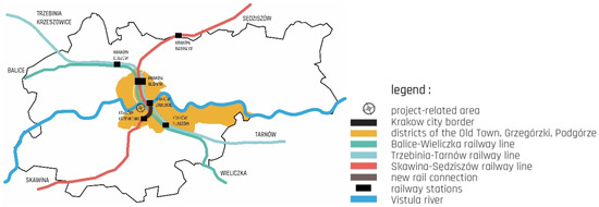 Cracow (Kraków) is one of the largest railway interchange stations in Poland (Figure 7). It is linked to the majority of cities in Poland, including express Pendolino links with Warsaw (Warszawa) and Gdańsk. In addition, it has international connections with Vienna, Prague, Budapest and Lviv. The Main Railway Station in Cracow along with the Małopolska Region Coach Station, municipal public transport (buses, underground fast tram) and the link to the Cracow-Balice International Airport make up a complex called the Cracow Public Transport Centre. By the end of 2020, four new rail tracks will have been built on two newly constructed railway trestle bridges on the crosstown line. The Polish Railways PKP Polskie Linie Kolejowe S.A. (Joint Stock Company) link the central railway station with the station Kraków-Płaszów facilitating thus the traffic of agglomeration and long-distance trains. The station Kraków-Zabłocie is currently under modernization, which is connected with the above-mentioned investment.