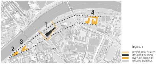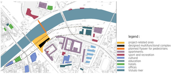 The subject of this work is a fragment of the riverside embankment of the river Vistula (Wisła) in Cracow (Kraków). This riverfront is in many respects a very interesting area, and it has not been properly developed yet. This particular site was selected due to its purpose: in urban planning documents this place is intended for the function of a local centre (Figure 2). It is a socially significant place. This site requires a proper approach to designing with a focus on the creation of architecture. After the research and spatial analyses, it was decided that a multi-functional complex should be designed to meet the needs of Cracow’s inhabitants and visiting tourists. This work and investigations concern the area which was designated as a local centre in the Study of Conditions and Directions of Spatial Development of the City of Cracow (Kraków).