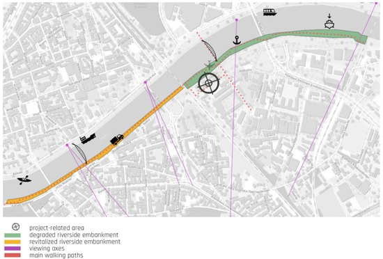 The riverside embankment called Podolski Boulevard (Bulwar Podolski), which is the subject of this work, stretches along the right bank of the Vistula (Wisła) river, between the mouth of the Wilga river and the railway bridge in Zabłocie. The embankment is linked with the other bank by means of Józef Piłsudski Bridge (Most Józefa Piłsudskiego) and Silesian Insurgents Bridge (Most Powstańców Śląskich) as well as railway bridges and the flyover for bicycles and pedestrians. The topography of the riverside area is varied. From the direction of the mouth of the Wilga River there stretches a retaining wall built in the late 19th century as flood defence. From the boundaries of the project-related area, the lie of the land changes into a floodbank descending gradually in the direction of the river. The further east from there you go, the more neglected and overgrown with wild plants the landscape becomes. The Local Plan of Spatial Development (Miejscowy Plan Zagospodarowania Przestrzennego) [12] provides for a place where the flyover for bicycles and pedestrians is to be built in order to link two banks of the Vistula (Wisła) river. There is an inland sailing trail on the Vistula River in Cracow called “Waterway of the Upper Vistula River” (“Droga Wodna Górnej Wisły”), which will implement sailing facilities as a further element of the programme of the development of inland waterways in Poland. Prompted by the inhabitants, the authorities of the city of Cracow (Kraków) are planning to implement a project of the Cracow Marina (‘Marina Kraków’). There is also an international cycling trail on the route of Cracow–Moravia–Vienna, which is an eco-tourism corridor revealing the cultural, natural and historic heritage of the Central Europe, including the longest alley of trees in Europe.