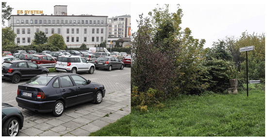 The preliminary analyses related to the study area provoked a number of questions, one of which is concerned with the lack of the appropriate development plan for Podolski Boulevard. The detailed assessment of the existing condition revealed that an intended space of historical commemoration was to be the Boulevard of Allied Forces Pilots (Bulwar Lotników Alianckich). Today, this area is still wasteland (Figure 10) (overgrown with grass and high greenery) despite the fact that nearby there are new apartment buildings and the Andrzej Frycz Modrzewski Higher School in Cracow. Only a plaque with the boulevard name stresses the significance of the area. Because of the fact that Zabłocie is characterised by the high-density housing development of the city centre, and yet does not have a payable parking zone, today the boulevard is often used as a “wild” car park.
