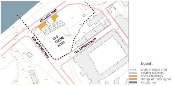 The list of objects and groups of objects under conservation and legal protection defined by the Municipal Plan of Spatial Development of 2006 clearly pointed out elements that required protection and inclusion in the project. In accordance with the decision on the enlisting of some objects in the project-related area in the heritage register, there are following objects and facilities in “ZONE A–Stare Podgórze (Old Podgórze)” which have been recorded in the heritage register [9]: restaurant “Zabłocie 13” and a cultural and community centre ‘Workshop’ (‘Warsztat’) (Figure 3).