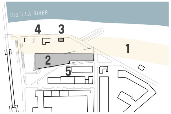 Embedding the object in the context: (1) Flood risk area, (2) Designed multifunctional complex, (3) Designed sports equipment rental, (4) Existing historic buildings, (5) Existing objects of the lighting company (elaborated by E. Latusek).