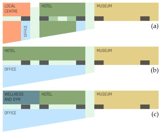 Functional diagram of the designed multifunctional complex: (a) ground floor; (b) repeatable storeys +1, +2; (c) storey +3 (elaborated by E. Latusek).