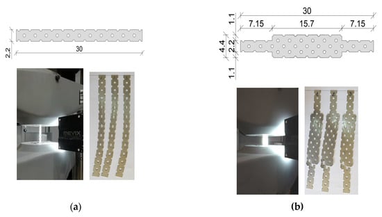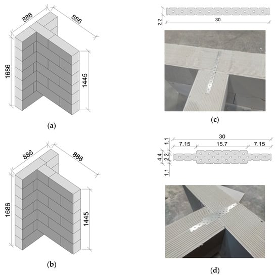 Three series (12 test models in total) with the same shape and dimensions were prepared and tested. T-shaped models were monosymmetric, with a web and flange length of ~89 cm. A vertical joint, whose structure varied intentionally, was formed between loaded and unloaded walls. A series of test models marked with P had traditional masonry joints between the web and the flange (Figure 1a). Those elements were regarded as reference models, whose mechanical parameters and behaviour at loading and failure were compared with results from other tests. In two other series, joints between webs and flanges were made with steel connectors (wall geometry acc. to Figure 1b). They were single punched flat profiles in series B10 (Figure 1c), and modified flat profiles with a widened central part in series BP10 (Figure 1d). This solution was proposed on the basis of our own tests [] on perforated connectors. The widening of the central part was intended to increase the flexural capacity of the connector and its stiffness. The proposed shape is copyrighted via an application to the Polish Patent Office []. Joints made of galvanized perforated steel with a thickness of 1 mm were used in both series.