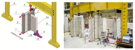 A scheme and photo of the test stand (longitudinal wall (1a), transverse wall (1b), reinforced concrete column transferring shear load (2), reinforced concrete pillars limiting horizontal deformation (3), horizontal support (4), system of the hydraulic cylinder and the force gauge used to induce shear stress (5), force gauge, vertical reaction (6), horizontal tie (7), steel frame (8)).