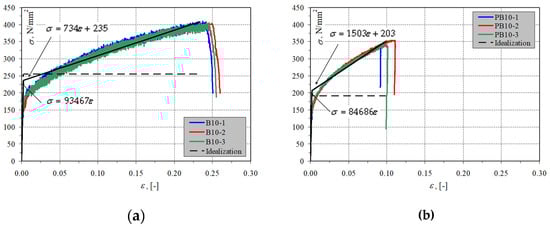 The mean friction coefficient in joints without mortar was μ = 0.92 []. The shear modulus determined according to the code ASTM E519-81 [] and presented in [] was G = 329 N/mm2. Mortar for thin joints was used in the tested elements for the AAC blocks. This mortar is dedicated to the erection of AAC masonry walls Additional tests on steel connectors—see Figure 3—were conducted according to the standard []. Three elements were chosen randomly from each series of connectors and placed in the jaws of a testing machine. The basic mechanical parameters of the connectors were determined by controlling the displacement gain. The measurement of strains was non-contact with a video extensometer MEVIX 200. Strain was measured using a base with the length Le = 53.5 mm in standard connectors and Le = 75.0 mm in thickened connectors. Figure 3 illustrates (stress σ –strain ε) relationships. The stress–strain relationship of tested connectors was found to have no clear yield point. Therefore, results were approximated with a bi-linear relationship. A theoretical yield point fy was determined at the intersection of straight lines. The slope of the tangent straight line presented within the range of 0–fy was assumed as the mean initial modulus of elasticity Es. Tensile strength was determined at failure of specimens, and the tangent of the straight-line slope within the range of fy–ft was determined as the mean secant modulus of elasticity Et. Test results for connectors and the research programme are compared in Table 1.