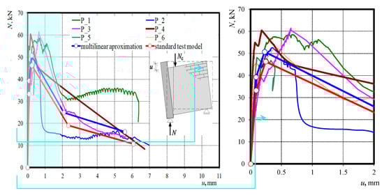 The cracking mechanism for elements is also visible on diagrams illustrating the relationship between the load N and relative (mutual) displacement u of bonded walls—see Figure 5. Until cracking of the contact surface observed under the load Ncr = 27.3–54.1 kN, increments in relative displacements u were almost directly proportional, and thus the working phase of the joint was called the elastic phase. After cracking in the post-elastic phase, stiffness was reduced. However, joints still had the capacity to take the load.