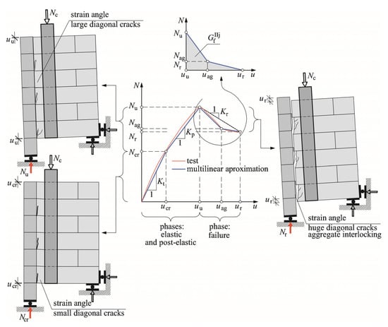 In the failure phase, during which dry shear fracture of separating walls was observed, the joint behaviour was mapped on the basis of standard behaviours specified in PN-EN 1052-3:2004. Those tests included measurements of relative displacements of two masonry units joined with mortar and determination of fracture energy of the joint = 2.37 × 10−4 MN/m [], which could be used to describe the behaviour of the brittle material in the failure phase in accordance with the continuum fracture mechanism. The failure phase was described on the basis of observations using two sections with forces varying from Nu to Nag, and then from Nag to Nr at corresponding displacements uu, uag and ur. Assuming that fracture energy per joint area (expressed as the area below the diagram shown in Figure 6) was equal to fracture energy , obtained from standard tests, the displacement corresponding to the residual force ur was determined from the relationship: