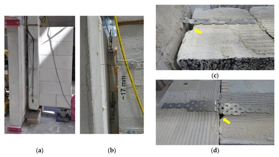 The behaviour of all unreinforced models was similar. No cracking noise and no visible splitting on the lateral surfaces of elements were noticed in the initial phase of loading. Non-dilatation strain in some parts of the wall was observed. That phase lasted until the appearance of the first diagonal cracks in the adjacent vicinity of wall joints—see Figure 4a,b. Load increments caused the distinct development of cracks present at the location of joints and propagation towards the reinforced concrete column which transferred loading (Figure 4c). The greatest force was registered in that phase. Continued loading led to the distinct growth of mutual displacements and the rotation of joined walls. The joint was removed after failure—see Figure 4d. Almost vertical shearing of elements forming the bond was found. No clear damage was reported in the case of other elements.