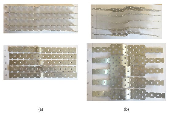 Deformed connectors removed from damaged test models after tests: (a) punched flat profiles in the wall B10_2, (b) punched widened flat profiles in the wall BP10_2.