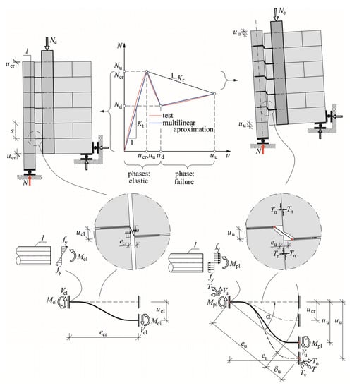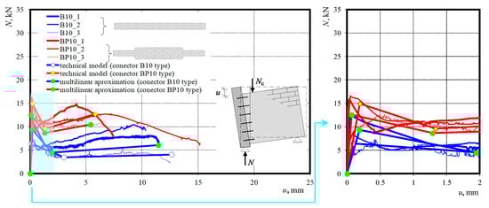 As the in case of unreinforced joints, phases of reinforced joints can be presented in diagrams illustrating the relationship between the load N and relative (mutual) displacement u of joined walls—see Figure 9.
