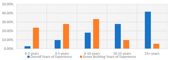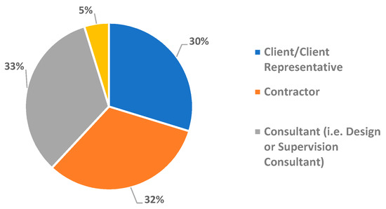 Figure 3 analyzes the firms, thereby presenting 32% contractor representation, 30% client representation, and 33% consultant representation. The years of experience of the managers vary, as shown in in Figure 4. This clearly indicates the relative newness of the green-building industry, given the significant proportion of fewer years of green-building experience compared to that of conventional-project experience. The portfolio of green-building projects in Figure 5 presents predominantly commercial (30%) and sports complexes (22%) projects. The remaining 48% are residential, schools/universities, healthcare, and offices.
