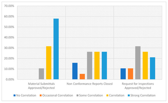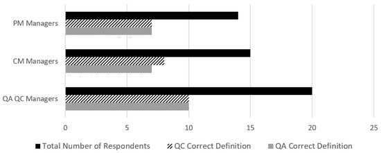 Quality control and assurance are two important mechanisms in quality performance domain and are distinguished based on the stakeholder party role covering for the mechanisms (quality assurance by the owner representative and quality control by the design or construction professional). To determine the respondents’ awareness of the quality assurance and quality control (QA/QC), the respondents were asked to match the QA/QC to its correct definition [51]. Figure 6 depicts the overall rate of correct responses across the various managerial types with respect to the total number of respondents with rates of 50–53% of correct definitions: