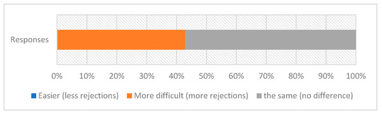In this study, it was determined whether the quality performance and sustainability traits were correlated by asking the SMs if the KPIs of the quality performance were affected by sustainability traits. The results in Figure 9indicate a strong skew towards a correlation of the sustainability traits in material submittals, non-conformance reports, and inspection requests, which confirms that the sustainability is directly connected with the quality performance of green buildings. This reinforces the notion that the quality-performance domain is crucial for successfully delivering green buildings. The QMs were asked whether they considered the quality KPIs to be more challenging in a green building than in a conventional building. The results in Figure 10 reveal a higher difficulty (50%) or the same difficulty (50%). However, no manager stated that meeting the KPIs of green buildings was easier than for conventional buildings. This may be attributed to limited types of energy efficient materials and technology types being available within proximity in the market [52].