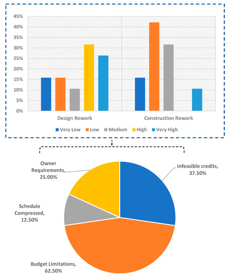 The SMs found that non-conformance related to sustainability was more likely to be rectified as a design rework rather than as a construction rework, as shown in Figure 11. This may be attributed to the substantial 43% of respondents claiming to have endured management dismissing certain sustainability credits for no longer being obliged to achieve them (such design omissions being found to be a root cause for design reworks according to Love, et al. [72]). In addition, according to Figure 11, 63% of respondents endured this type of credit dismissal because of budget limitations and 13% because of schedule compression. This could have been avoided if CMs had been involved in the design stages to give constructability feedback before the full dedication to such green-building credits.