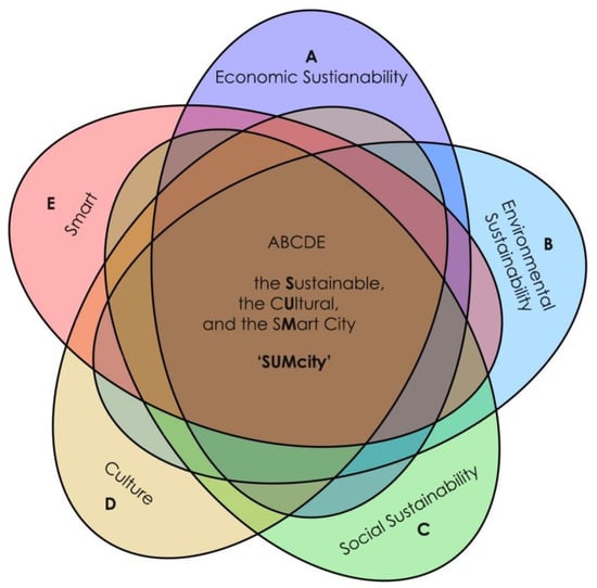 Building on the background of the existing theories, as mentioned above, this research introduces a quintuple bottom line matrix (5BL) of the sustainable, the cultural, and the smart city. Using the five-set Venn diagram with congruent ellipses in a radially symmetrical arrangement devised by [41], as illustrated in Figure 1 it is suggested that a city’s long-term balanced coordination can only be achieved through treating all five inter-required aspects in a simultaneous and parity-based fashion. These five aspects of the sustainable, the cultural and the smart city are: (a) economic sustainability, (b) environmental sustainability, (c) social sustainability, (d) culture, and (e) smart city initiatives.