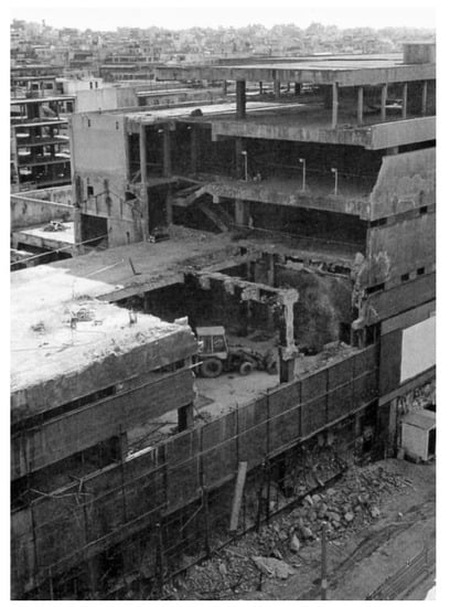 In 1994, the FIX building’s northern part was demolished in order to facilitate the construction of the subway (Figure 3). Architects, urban planners, heritage conservators, and scholars have since heavily criticized this act [45].