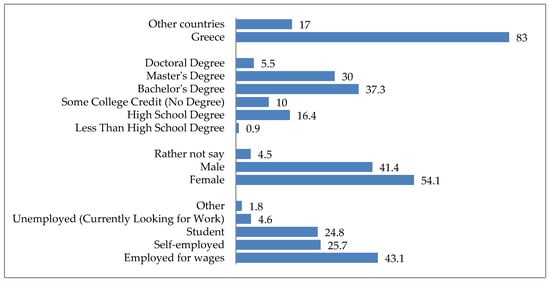 A total of 110 Instagram users participated in the online survey, including mostly Greeks, as well as tourists. The percentage of women responding was higher (54.1%) than that of men, providing an average of 31 years of age (min 18; max 62; median 34.5). Regarding educational level, the majority of the respondents are university (post)graduates (72.8%). Thus, the sample is mostly comprised of the young and highly educated, a finding which is consistent with the representativeness in online surveys [50]. Regarding respondents’ occupation, 68.8% were working when the survey was conducted (employees, self-employed, and civil servants), while, of the remaining, 24.8% were students and 4.6% were unemployed (Figure 5). As for their personal monthly income, respondents reported having an average monthly personal income of €604 (min 100; max 5000; median 950). The respondents’ profile analysis is consistent with the wider literature and official statistics as well as the economic reality in Athens [50,51].