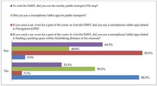 Quite naturally, in order to approach the museum, one will either have to use public transportation or a taxi or a private car. In either case, using a smart app when moving around a metropolitan area like Athens can often be an easier and a much quicker way [52]. However, although the majority of the respondents reported using public transportation (64.5%), at the same time they report somewhat weak impressions of public transportation smart apps. On the contrary, respondents report they would use a smart app intended to help them navigate towards their destination using their car, not being particularly concerned about finding a nearby parking lot; perhaps mainly due to the existence of an organized Metro parking facility at Syngrou-FIX station. A total of 90.5% report that they parked their vehicles at the organized Metro parking facility at Syngrou-FIX station (Figure 8).