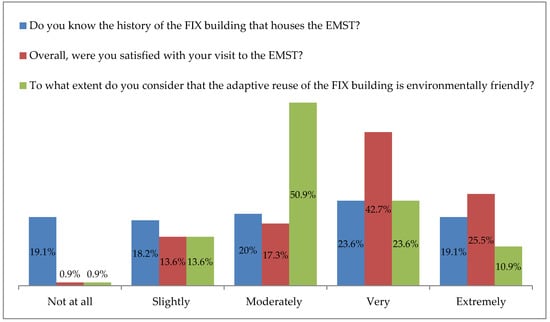 Overall, respondents were quite satisfied with their visit to the EMST, while they seemed to believe that they are familiar with the history surrounding the FIX building (Figure 10). In particular, female respondents report greater satisfaction (71.6%) with their visit to the museum compared with male respondents (65.2%), as well as a higher degree of knowledge and understanding of the FIX building history than men (37%). In addition, a considerable number of respondents (34.5%) state that the adaptive reuse of the FIX building is, to a great degree, environmentally friendly (Figure 10).