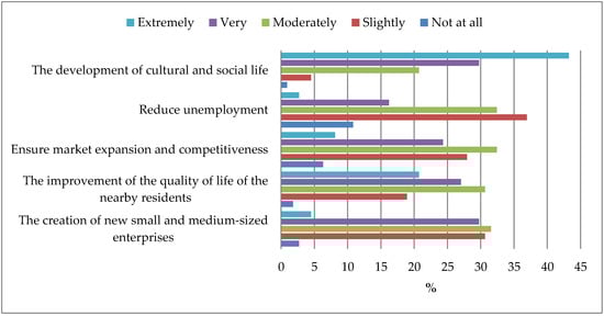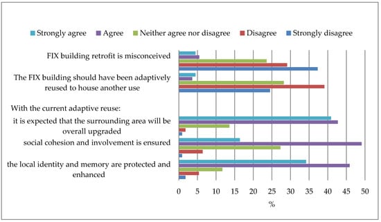 Furthermore, respondents report that the adaptive reuse of the FIX building to house the EMST contributes to the development of cultural and social life and the improvement in the quality of life of the nearby residents, as well as ensuring market expansion and competitiveness (Figure 12). However, Instagram users do not support that the adaptive reuse of the FIX building to house the EMST contributes to the creation of new small and medium-sized enterprises in the nearby surrounding area, or that it contributes to the reduction in unemployment.