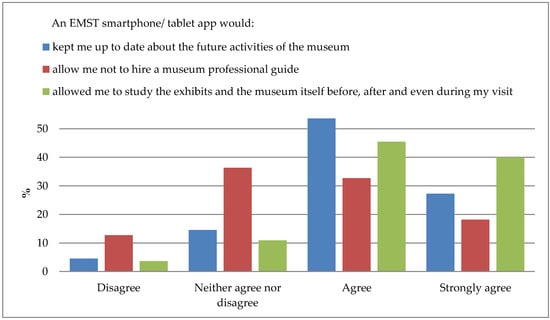The following questions were about new and smart technologies and their applications. Of course, the Instagram users were quite familiar with new and smart technologies and applications (50% and 33.6% report being extremely and very familiar, respectively). Furthermore, 91.8% highly support that social media can also serve as a source of information. Their activity on social media seems to be quite intense, as they use it at least twice a day (82%) or more. Respondents appear to frequently post photographs on their social media; however, the majority were not following the museum’s Instagram account. However, the fact that the respondents (92.7%) report that the existence of a museum smart app as being a factor that could affect their choice to visit the museum is extremely important. In particular, respondents state that such a museum smart app would keep them up to date about the future activities of the museum, and it would allow them to study the exhibits and the museum itself before, after, and even during, their visit (Figure 13).