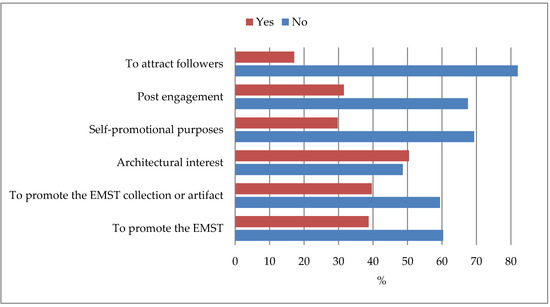 Finally, it is worth noting that one of the main reported reasons the respondents posted a geotagged photograph on Instagram from their visit to the EMST is out of architectural interest, followed by willingness to promote the museum, its collection or a specific artifact (Figure 14).