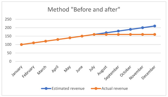 This method compares, on the basis of accounting documents from the contractor, its profitability in anticipated sales and actual sales (Figure 5). Thanks to the given data it is possible to estimate what profits the contractor would have had in the absence of unlawful conduct on the part of the customer. This method takes into account all market trends and other impacts that may contribute to an inaccurate estimate [23]. Due to its simplicity, this method is one of the most widely used methods of determining the amount of lost profits abroad. However, it requires increased demands on managing internal records broken down to contract, not only for the selected accounting period. An example of this method can be seen in the following simple chart provided that the fictitious contractor company is working on only one contract for the client who withdraws from the work contract during construction.