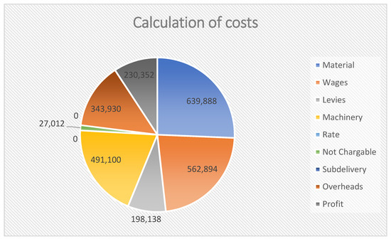 Calculation allows you to track costs by the purpose of their spending and location (Figure 7). This method is already recognized as a traditional cost and profit calculation that provides information where costs arise and who is responsible for costs [25]. The most widespread method used in construction practice to quantify lost profits is the use of existing valuation bases and indicative price databases. For this purpose, it is possible to use valuation tools such as Cenkros 4 software, which uses a calculation structure of costs and a separate economic category-profit for the database of indicative prices of construction and assembly works. This calculation structure allows the calculation of the profit rate with a corresponding percentage of the total price of the construction contract.