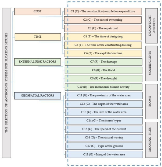 The basis of the hierarchical structure tree (Figure 2) was a set of criteria proposed in the on assessment by the judges at the Brainstorm session. As a result of the AHP analysis of the most advantageous anchoring system for floating houses, four main criteria have been distinguished, i.e., cost, time, external risk factors, and geospatial factors. Each of the main criteria includes sub-criteria presented in Figure 2.