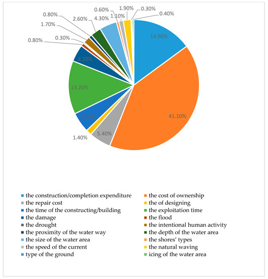 - Criteria: the construction/completion expenditure C1 (T), the cost of ownership C2 (T), the repair cost C3 (T), the time of designing C4 (C), the time of the constructing/builing C5 (C), the exploitation time C6 (C), the damage C7 (R), the flood C8 (R), the drought C9 (R), the intentional human activity C10 (R), ), the proximity of the water way C11 (G), the depth of the water area C12 (G), the size of the water area C13 (G), the shores’ types C14 (G), the speed of the current C15 (G), the natural waving C16 (G), a type of the ground C17 (G), icing of the water area C18 (G);