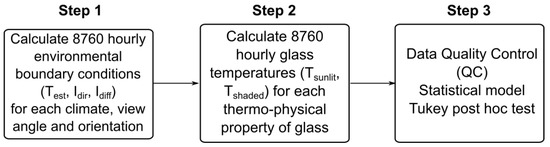 The temperature gradient ΔT between the sunlit and shaded parts of a glass was calculated in the first two steps of the process map shown in Figure 2. Step 1 determined the 8760 hourly values of environmental boundary conditions (Test, Idir, Idiff) for each parameter shown in Table 4. Step 2 then determined the values of Tsunlit, and of Tshaded, for each possible combination of insulation/glass types shown in Table 1 and Table 2. Overall, 2,128,680 temperature gradients ΔT were generated. Step 3 involved data analysis as described in 2.2.3.