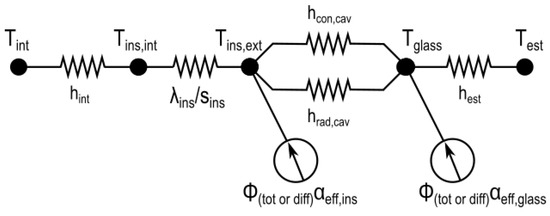The generated thermal network for the problem is shown in Figure 5. and are the convective and radiative conductances of the air cavity and they are defined in [19]. The former was defined as: