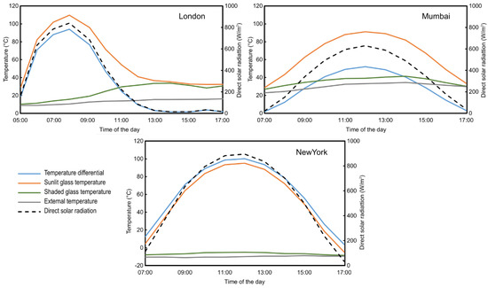 The days of occurrence of the highest temperature gradient have been plotted per each location in Figure 6, showing the temperature variation and the relevant daily fluctuation of the direct solar radiation. The combination of glass type and insulation color was “nearly opaque”/“light” for all conditions. Peak values from these days have been used for the sensitivity analysis shown in Appendix A.