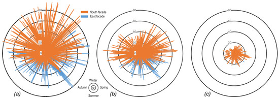 Figure 7, Figure 8 and Figure 9 show the yearly variation of the temperature difference for the three locations, the three view angles (0°, 30° and 60°) and two out of three orientations (south and east). The combination of the thermo-physical properties of glass and insulation were the ones leading to the maximum temperature gradient: nearly opaque glass and light insulation color.