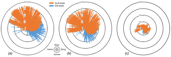 Results from Table 5, Table 6, Table 7, Table 8, Table 9 and Table 10 showed specific trends with respect to the selected variables. Understanding the view angle is of fundamental importance, as the solar radiation is reduced by the presence of external shading from the front-facing buildings. On average, reduction rates of 35% and 60% in the maximum temperature gradient were found for view angles of 30° and 60°, respectively, if compared with the 0° case in the three locations analyzed.