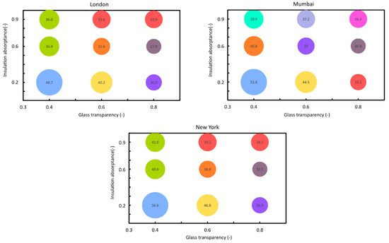 In step 3, the incidence of the thermo-physical properties of the analyzed spandrel on the temperature gradients was determined. Figure 10 shows, for the three locations, the least-square mean (radius) of the temperature gradients per each level of interaction between glass transparency and insulation absorbance. In each of the diagrams in Figure 10, all values that share the same color are not to be considered statistically different, i.e., the combination of glass transparency/insulation absorptance leads to similar results in the Tuckey post hoc test. In London, all combinations of glass transparency/insulation absorbance resulted in statistically different values except for two combinations: glass transparency equal to 0.4 and insulation absorbance equal to 0.6 and 0.9. In Mumbai, all possible combinations led to statistically different results in terms of temperature gradients (p < 0.05). Akin to London, in New York, glass transparency equal to 0.4 with insultation absorbance equal to 0.6 and 0.9 showed predicted means which were not statistically different (p > 0.05). The combinations between glass transparency and insulation absorbance, (0.4, 0.6) and (0.4, 0.9), and (0.6, 0.9) and (0.8, 0.9), led to non-statistically different results (p > 0.05); all other combinations resulted significantly different from each other.