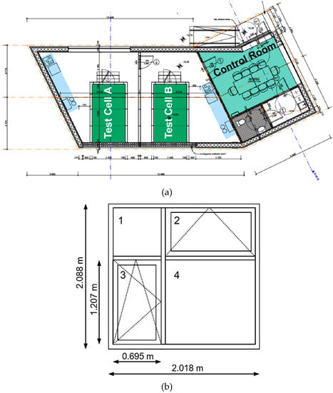 (a) plan of the ZEB Test Cell []; (b) scheme of the cell window [].